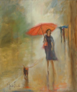 The artist enjoys oil painting en plein air, whether on a mountainside or along a marsh. She is often inspired to listen to that still small voice that speaks to her, sometimes quietly, filling her with awe and gratitude, and moving her to create. Simple ideas become visual expressions of her personal epiphanies: morning light glistening on a wooded stream, a sunset punctuating a cloudy sky, fresh spring blossoms highlighting an otherwise gray day, a red umbrella piercing through the rain.