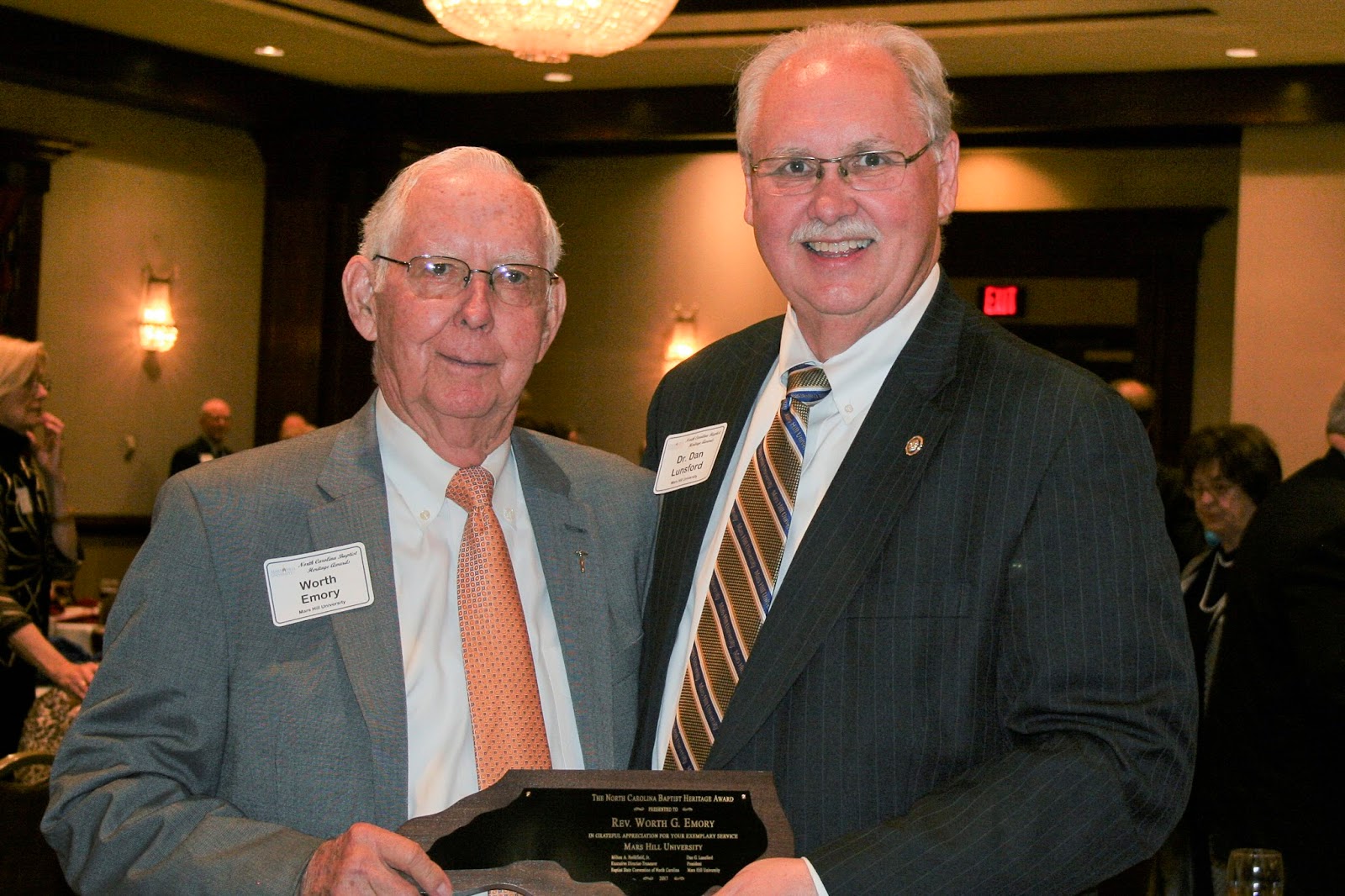 Mars Hill University presented its 2017 Baptist Heritage Award to Rev. Worth Emory of Weaverville, North Carolina, pastor of Ivy Hill Baptist Church. The award was presented April 25, 2017, at the 17th annual North Carolina Baptist Heritage Awards ceremony in Greensboro. The awards are co-sponsored by the Baptist State Convention of North Carolina and the North Carolina Baptist Foundation.