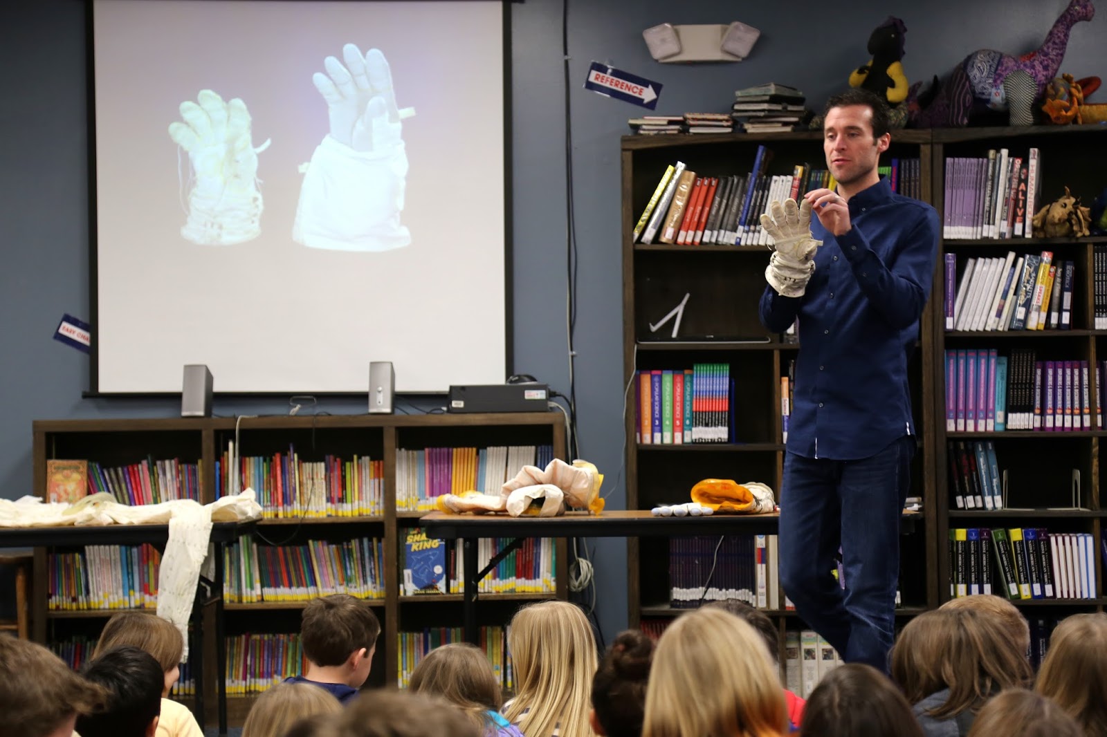 Carolina Day School Kindergarten through seventh grade students got a glimpse into what it’s like to be an astronaut with NASA’s Shane McFarland. McFarland is a project engineer for NASA’s Johnson Space Center on spacesuit and spacesuit technology development. He gave an interactive presentation about some of the projects he is working on, including a revolutionary space suit to be used to send an astronaut to Mars. Students got to hold pieces of space suits, from gloves, boots, to hydration pouches. All pieces of hardware came from suits either used for testing or sent up to space. With each item he passed around, McFarland pointed out in pictures where the piece comes from on the actual space suit.