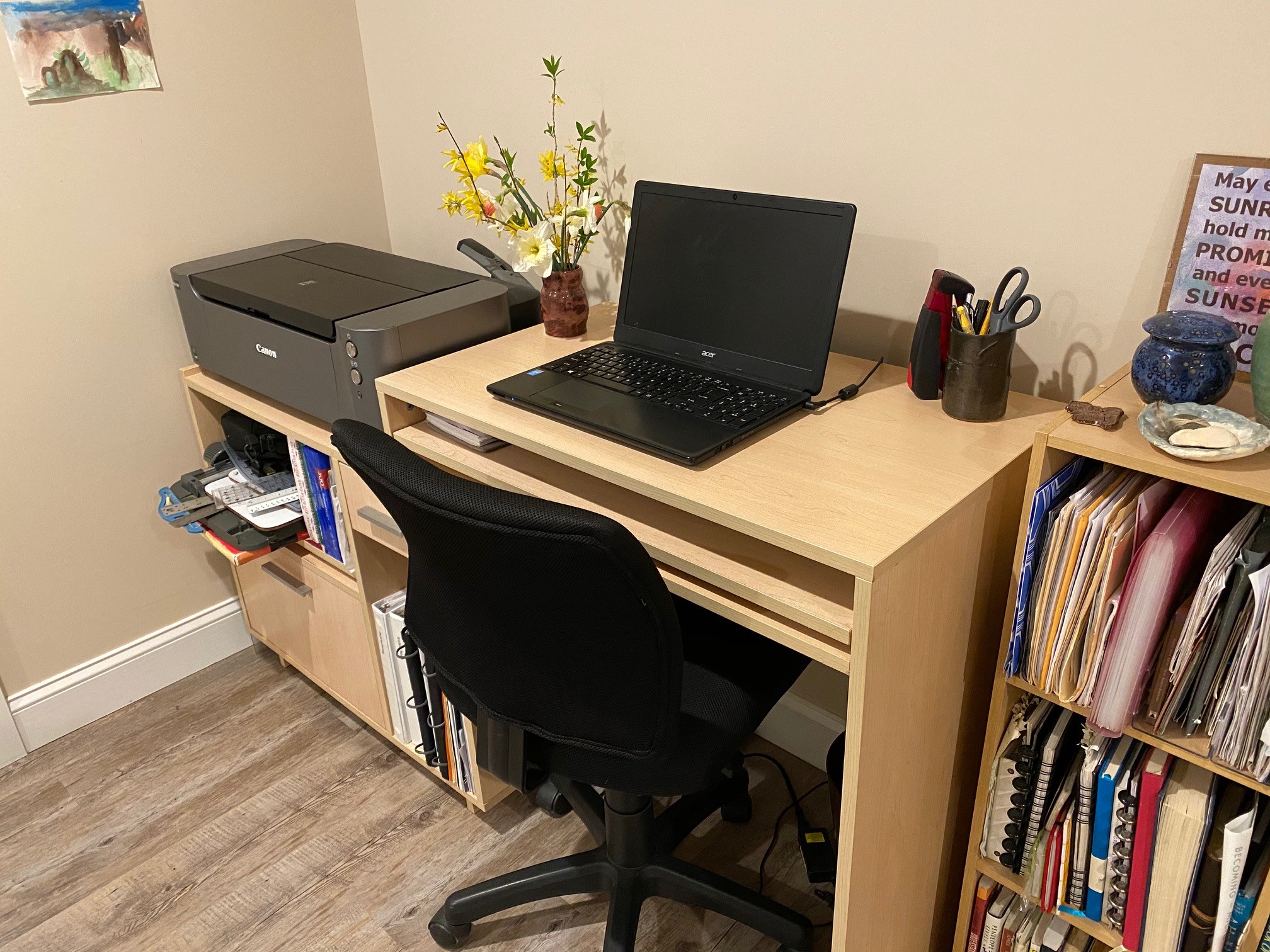 There’s nothing glamorous about my home office, which is basically a cubby in the wall, but I do get to snuggle with our cat Bug while I work.”
